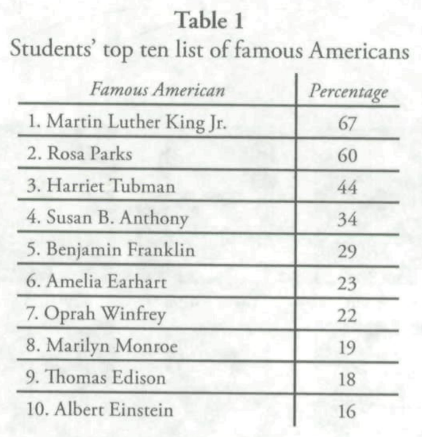 I found this reading interesting because it focused on who students and adults see as the most famous people in American history. Many people listed Martin Luther King, Jr., Rosa Parks, and Harriet Tubman, all three of which were key in the fight for racial equality. These were the top three most famous Americans on many students lists. When it came to differences between student responses, the biggest difference came because of race. White students listed these three names but at a smaller percentage than black students. White students tended to list a combination of black and white figures, while black students tended to list mostly black figures. I thought it was interesting that the authors asked students who the most famous Americans in history were with the restriction of no presidents or wives of presidents. They knew that if they would not have placed this restriction, students would list only presidents as the famous Americans. They wanted to see who students thought were famous without including presidents. They gave students ten blank lines and told them to write down who they thought was important to American history, then asked them to specifically list women. By doing this they found that if students had women listed in the first part of the list, they would often erase the women and place them only in the second part of the list.